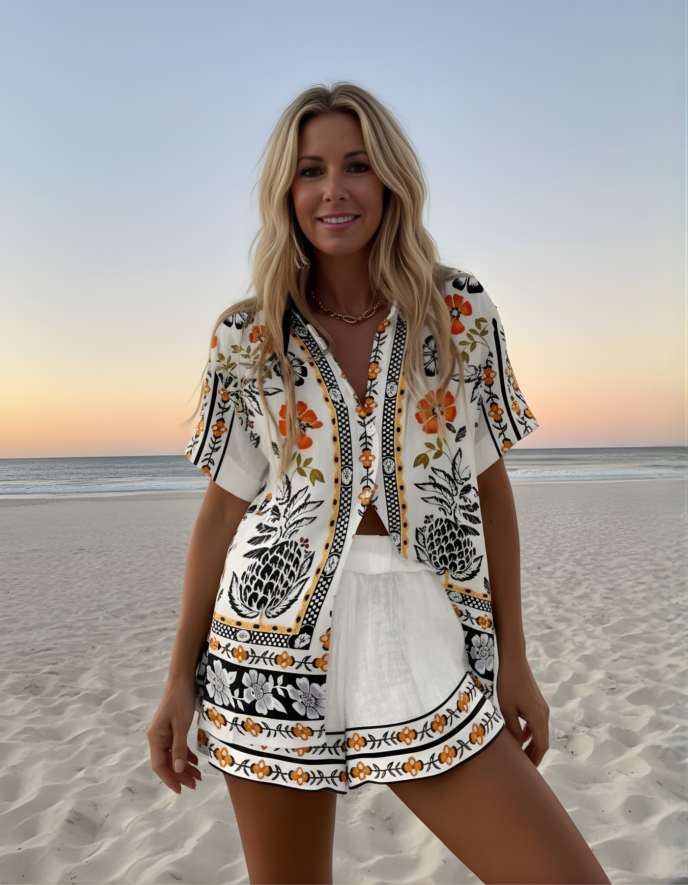 Immerse yourself in floral elegance with the Irella short summer suit featuring a floral pattern. This lightweight set, designed for breezy days and sunny vibes, will elevate your look with its soft fabric and romantic flower design. Perfect for garden parties, beach outings, or adding charm to everyday outfits – pair it with sandals and a soft bag to complete the look.