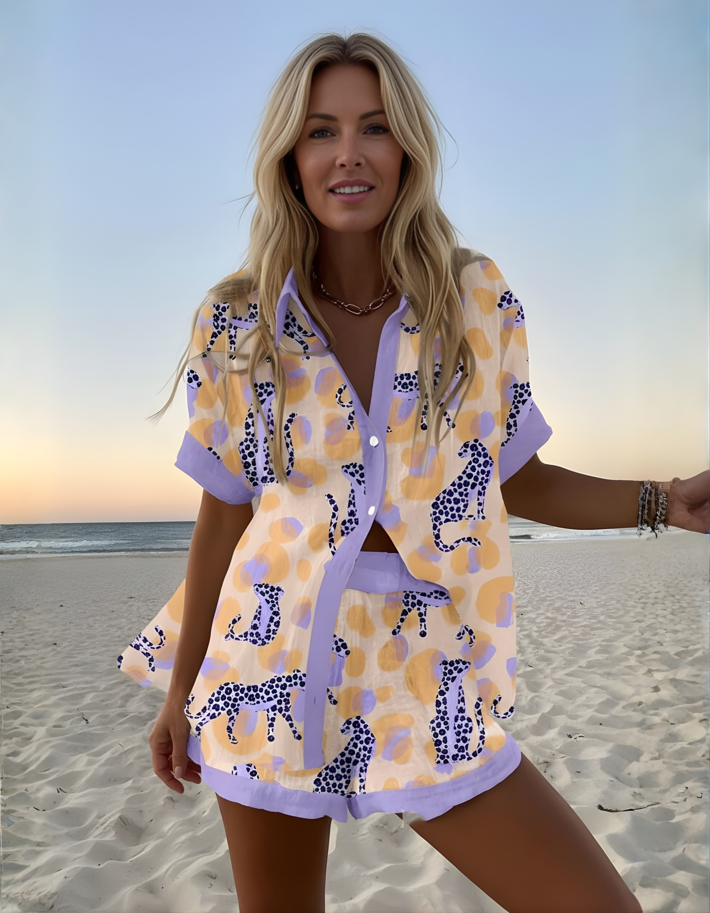 Express yourself with Reolia's short summer suit featuring a leopard print. This two-piece set combines a classic animal pattern with breathable comfort – perfect for those who love to stand out. From rooftop drinks to weekend markets – you'll turn heads without sacrificing comfort.