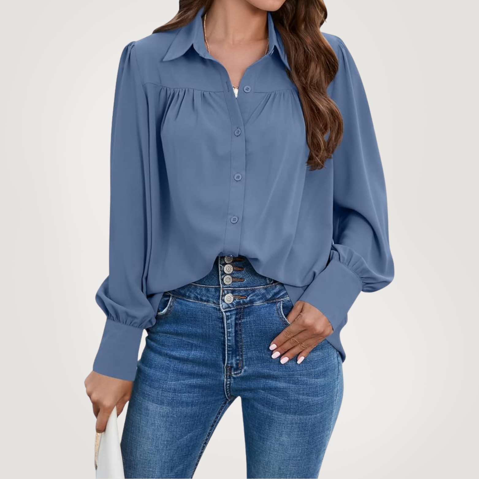 This lantern sleeve blouse is understated yet undeniably chic — the kind of piece that quietly elevates everything you pair it with. From the subtle pleats at the bust to the soft drape of the fabric, it's the blouse you reach for when you want to feel polished without even trying.