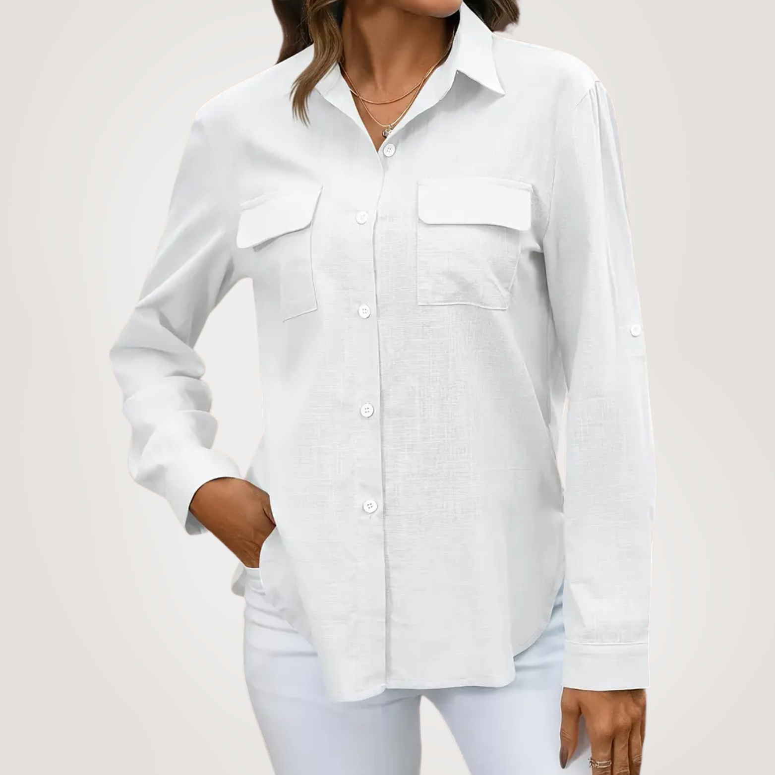 With its timeless look and relaxed structure, this blouse is a warm-weather staple. The utility-inspired pockets give it a clean, put-together look — perfect for dressing up or down with ease.