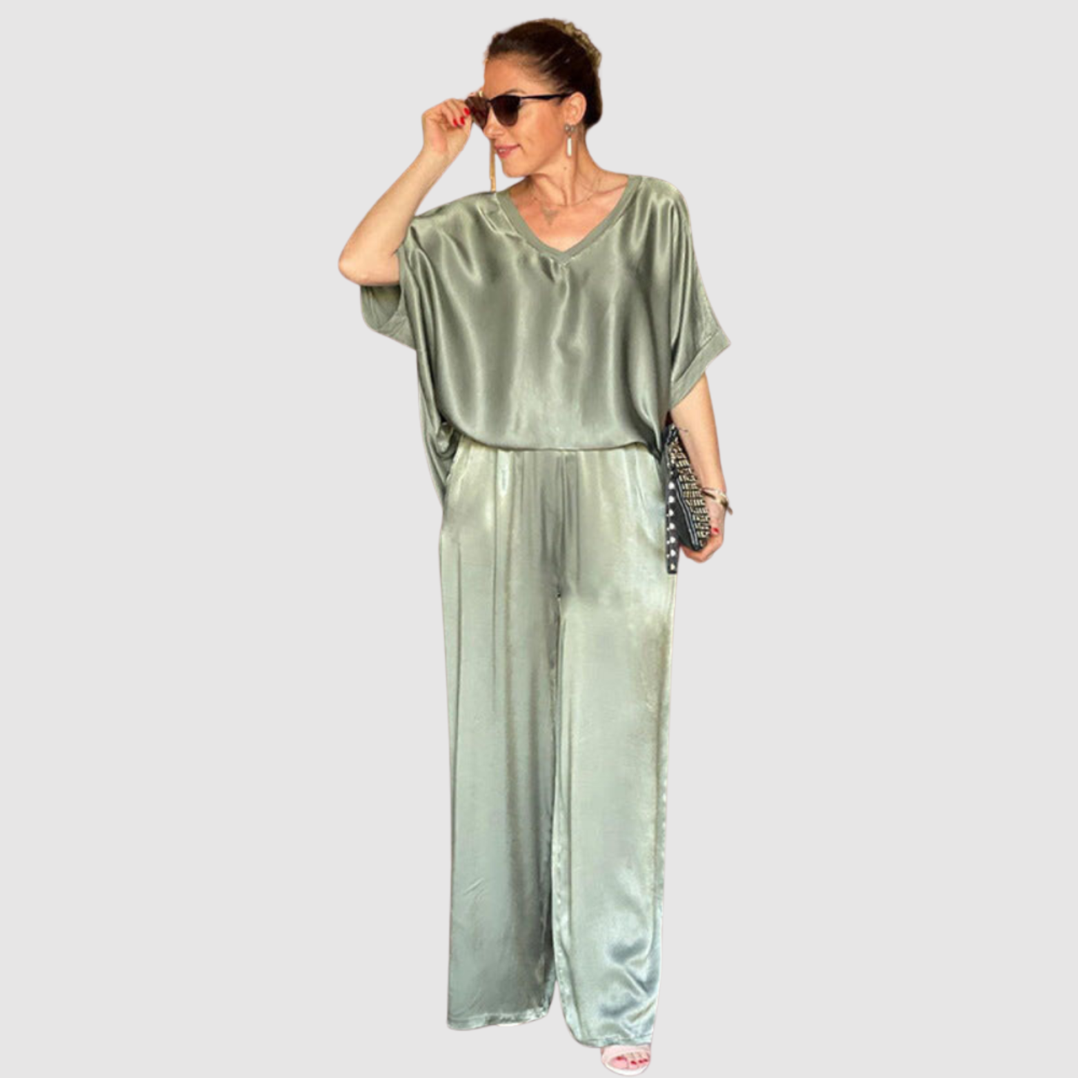 Feel effortlessly confident and elegant in our chic two-piece set. This set is designed to perfectly combine elegance, comfort and a touch of glamour. The loose silhouette gracefully embraces your curves, while the shiny finish adds a touch of sophistication. Whether you're attending a special event or simply want to enhance your everyday style, this two-piece set is a must-have addition to your wardrobe.